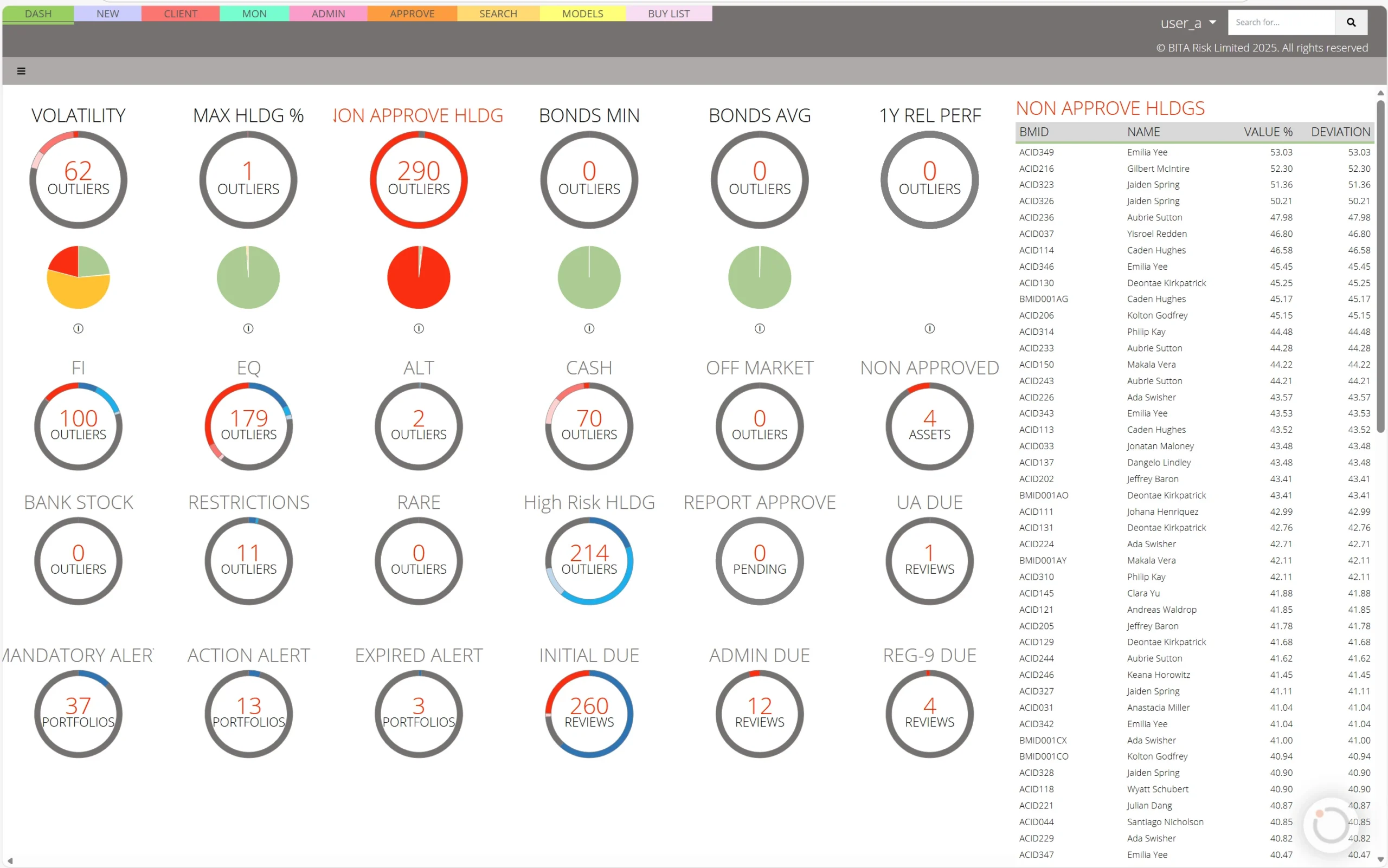 Provides a Compliance overview as well as a view for Investment/Trust Officers of their clients across 40 metrics covering Admin. Checks, Portfolio Rules, and Reports due. It auto-generates on-screen portfolio action lists that follow the user through the system making portfolio reviews fast, easy and focused. From an enterprise oversight, drill-down to the asset that is causing the problem in just three clicks.
